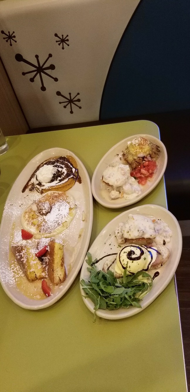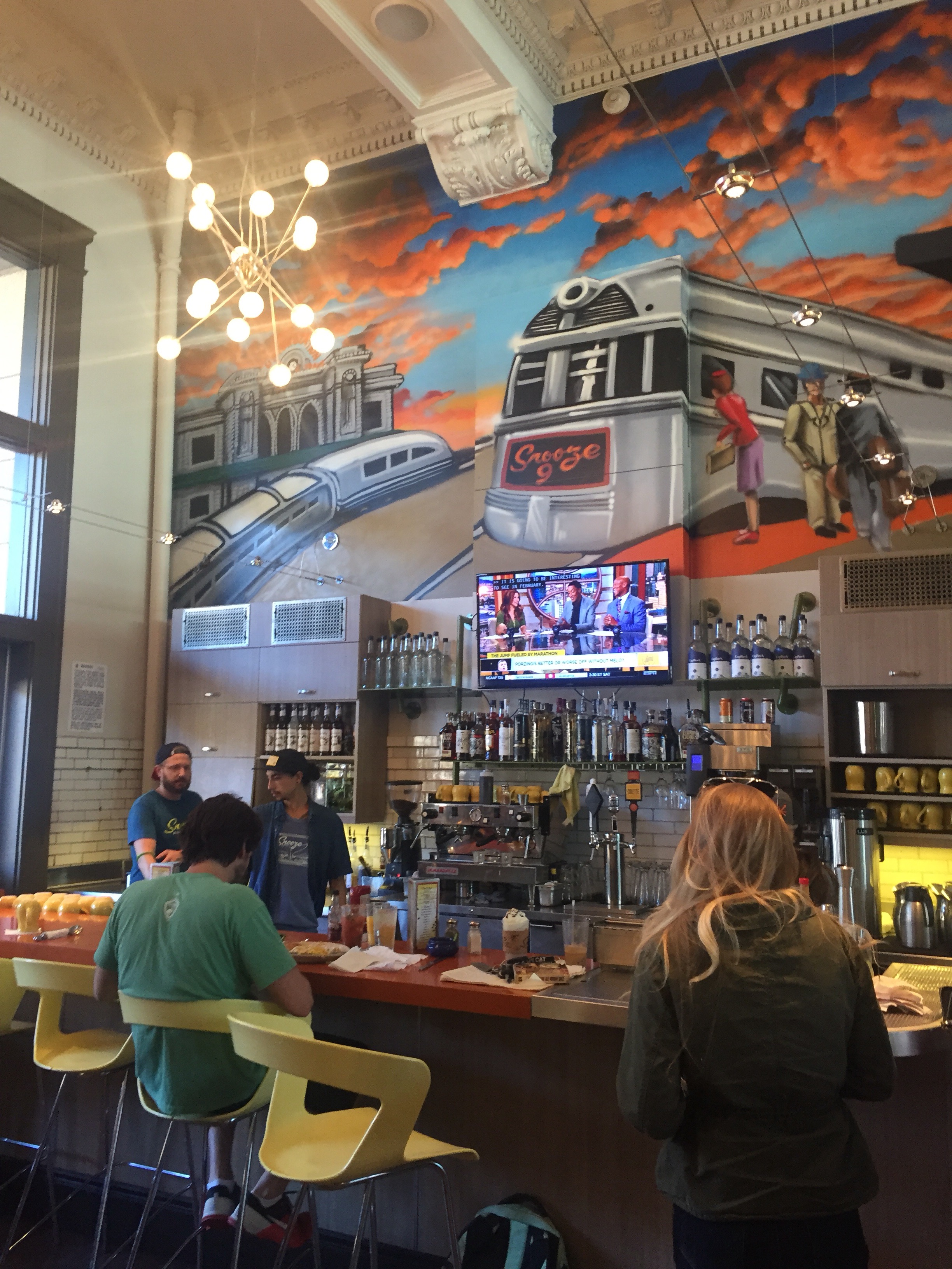 Since Snooze is highly recommended on any blog or site you can find, we knew it would be pretty busy during the morning hours, and instead decided to grab brunch there in the Station. Warning: the menu offers almost too many mouthwatering choices. If you have to wait for a table, go ahead and decide what you want to eat. We decided to do a pancake flat with pumpkin pancakes, pineapple upside down pancakes, and the OMG! french toast (Brioche stuffed with mascarpone, griddled and topped with vanilla crème, salted caramel, fresh strawberries and toasted coconut… seriously O. M. G.). I would highly recommend doing a flat, as not only the flavors of the pancakes & french toast are unique, but it was out of this world delicious! We also enjoyed the bella bella benny and chili verde benedict with hashbrowns, topped off with a bloody mary.