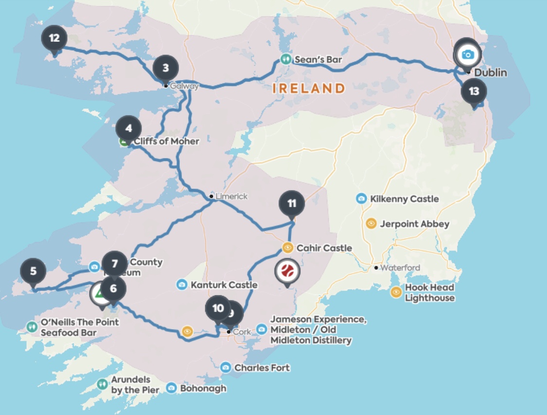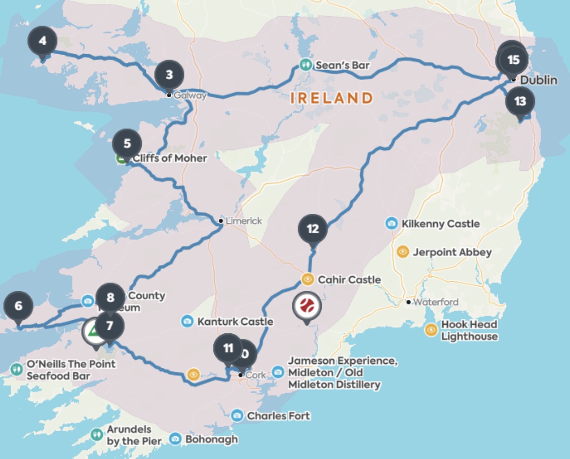 The original plan was to complete a circle starting from Dublin, over to Connemara, down to Dingle, then hitting interesting places back to Dublin (quite a few castles, estates, etc. along this route). As you can see here, with enough time and correct planning, this would probably be the best route.