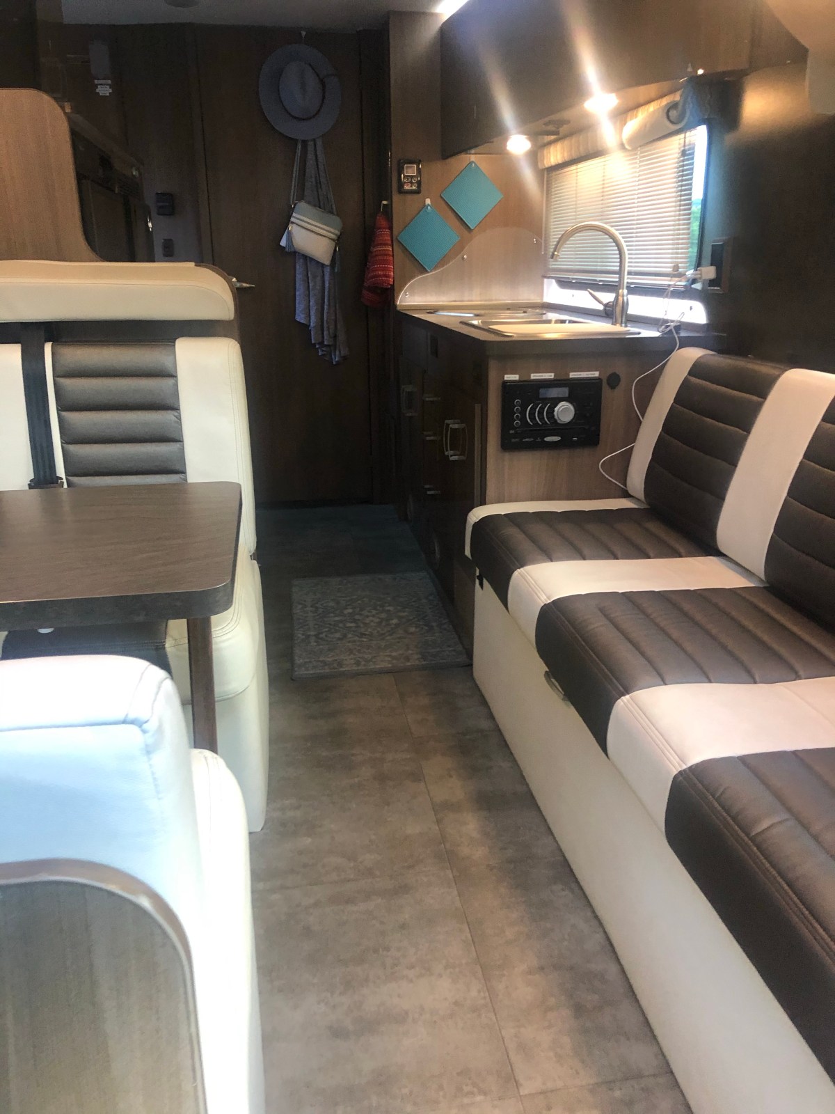 We ended up renting a 2015 Itasca Viva. It had a bed that pulled down from the ceiling that could easily be put up when not in use. The cushions from the sofa also rolled out to create a bed, which we used for napping while en route. I love this little RV.