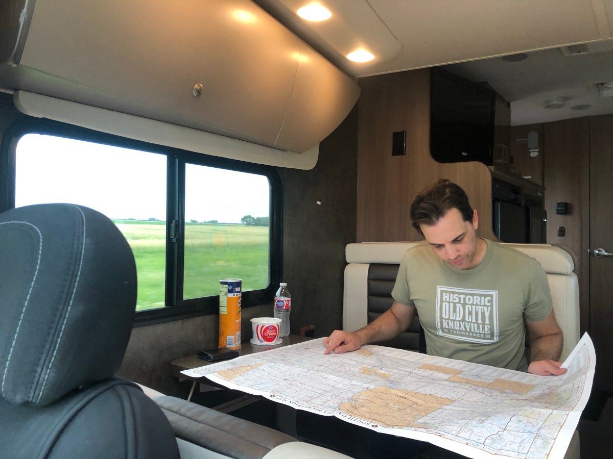 Scott using a map to scout out camping locations.