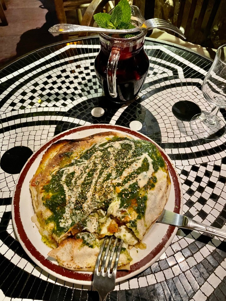 Sangria– Wine mixed with slices of fruit, often with other drinks (lemonade, orange juice), or spirits. Sangria originated in Spain, and is very popular here. It is found in most every restaurant. Salterio can boast for pretty yummy sangria. The food here is amazing as well. I ordered the pesto sardos, which are tortillas filled with cheese and other toppings, almost like a circular calzones, with additional sauces on top.