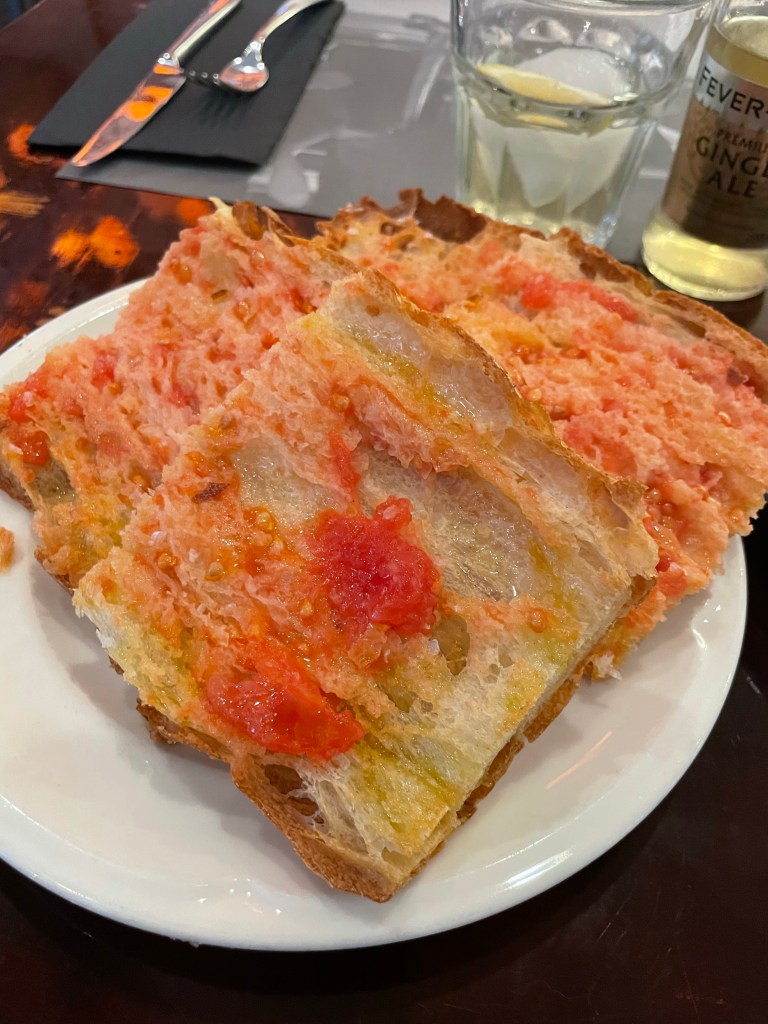 Tomato Bread– Just what it sounds like, bread with tomato on it. This is a staple in Barcelona. In many places, tomato bread itself a tapa. If you order a sandwich in Spain, it will be the base of the bread. It is simply toasted bread with olive oil drizzled on top, then tomato rubbed on the bread (not chunks or pieces of tomato usually), just enough to give the tomato flavor. Elsa y Fred also had wonderful tomato bread.