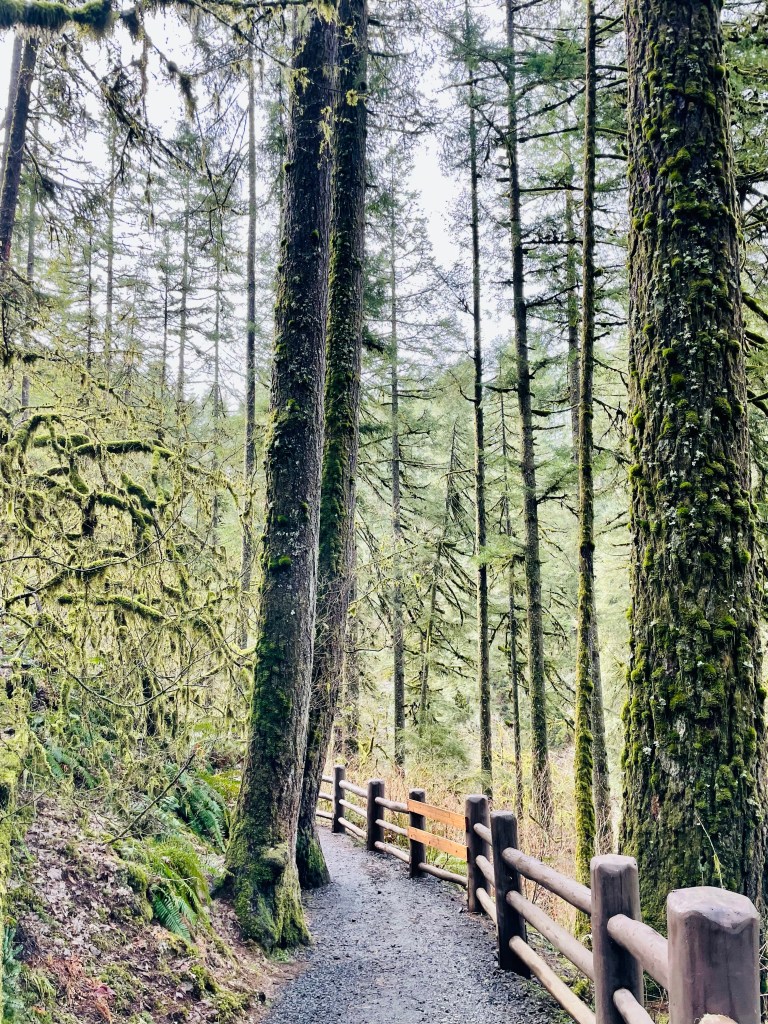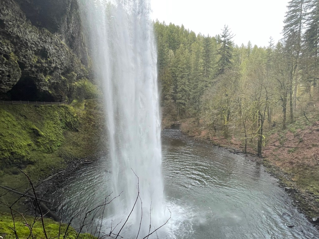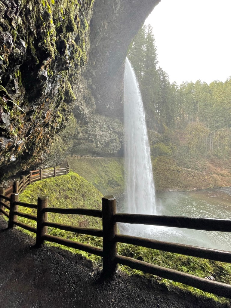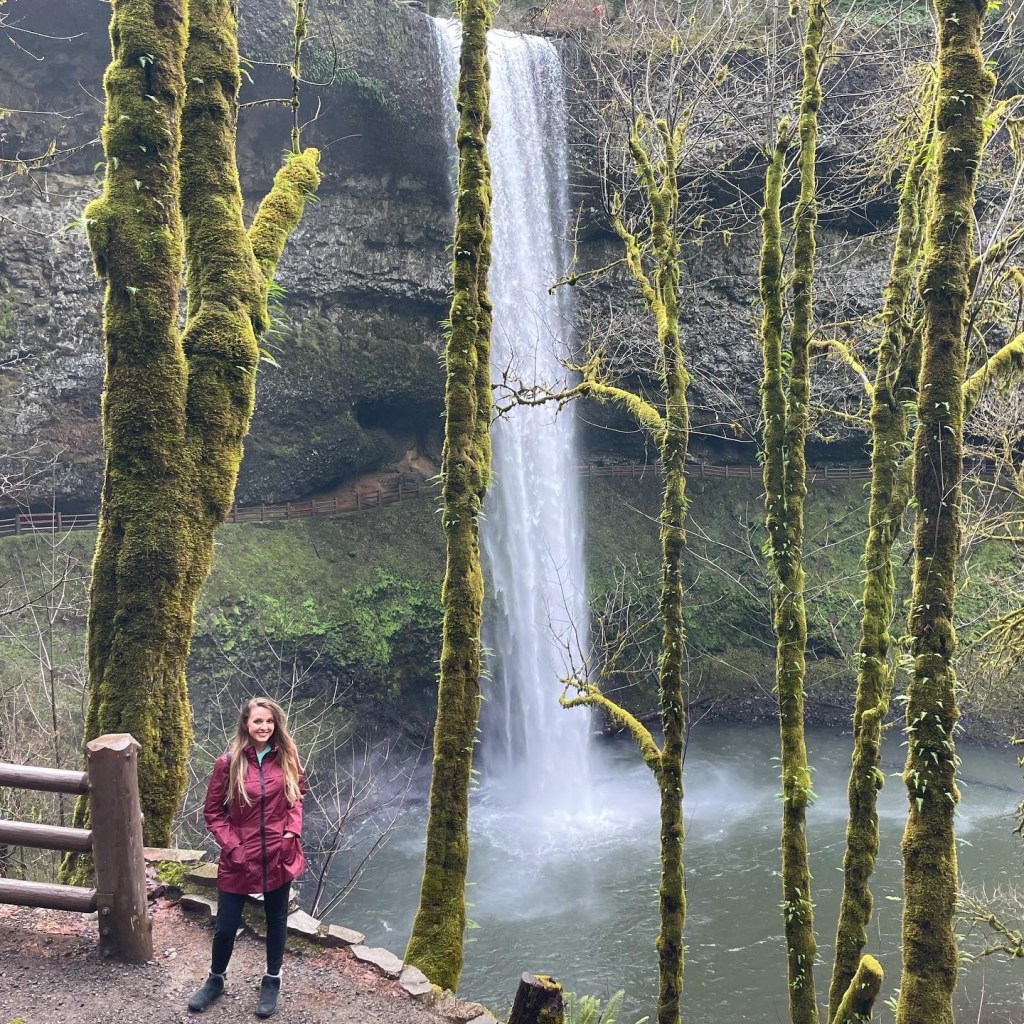 The waterfall I most recently visited is not in the Columbia River Gorge, but was instead about 30 miles east of Salem in Silver Falls State Park. Silver Falls really showcases Oregon’s beauty, with its huge trees, bright green moss, and plethora of waterfalls. This park is home to the Trail of Ten Falls, which is about 8 miles roundtrip and takes you to.. go figure.. 10 waterfalls (4 of which you can walk behind!). Unfortunately, I forgot my hiking boots at my hotel (fail!), so I only made the brief hike down to South Falls, the first stop of the loop (less than 1 mile) and drove up to the overlook for North Falls. South Falls completely took my breath away. It is powerful and tall (177 ft), and what I loved most is that you can walk behind it to completely experience it from every angle. It is one of the most photographed waterfalls in Oregon, understandably.