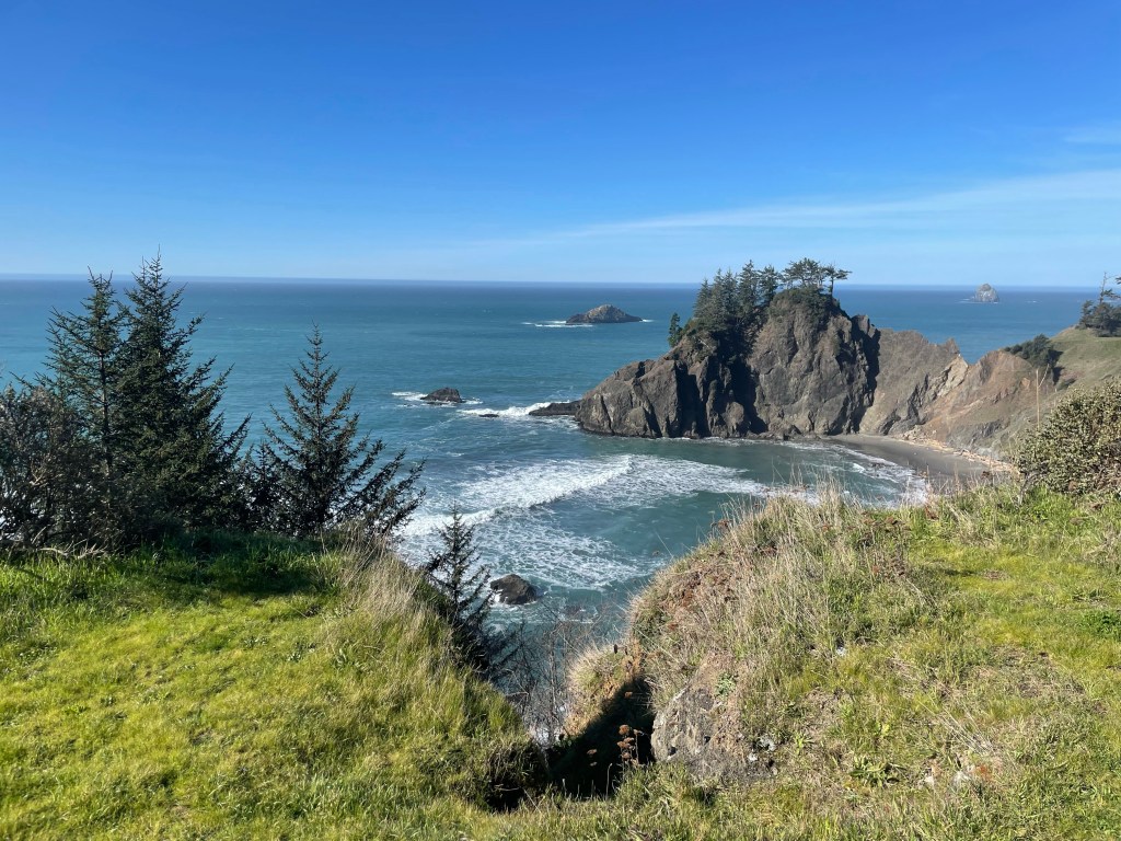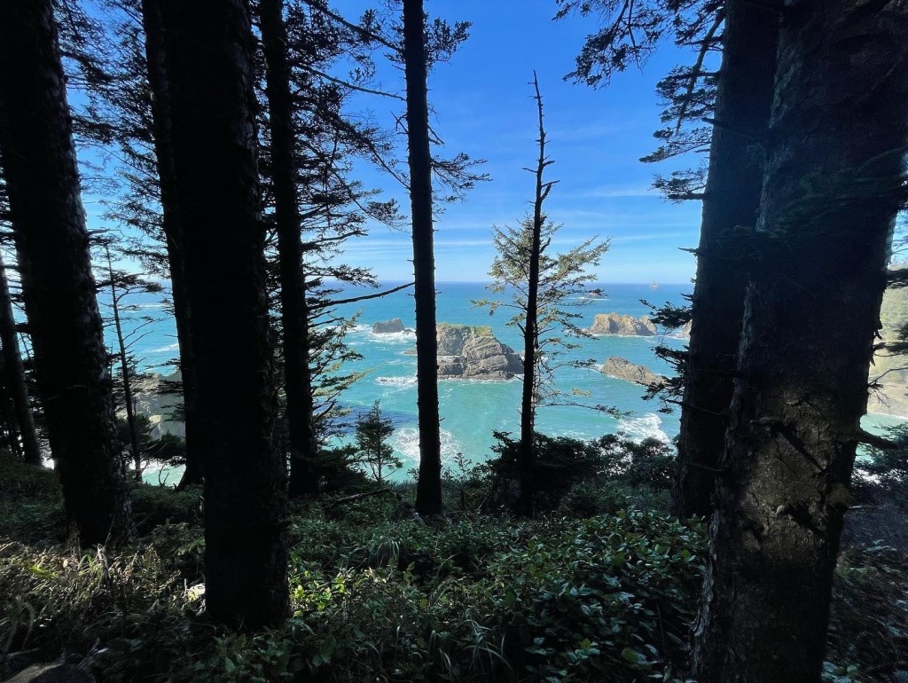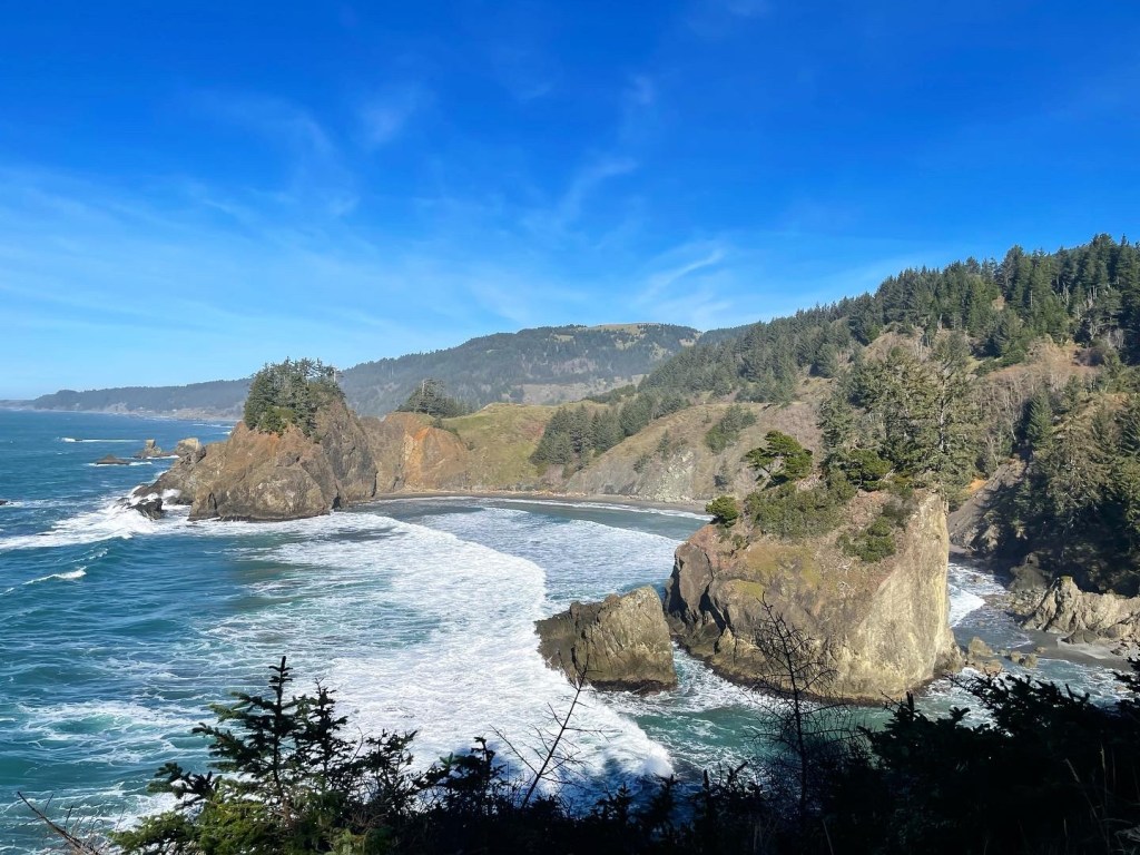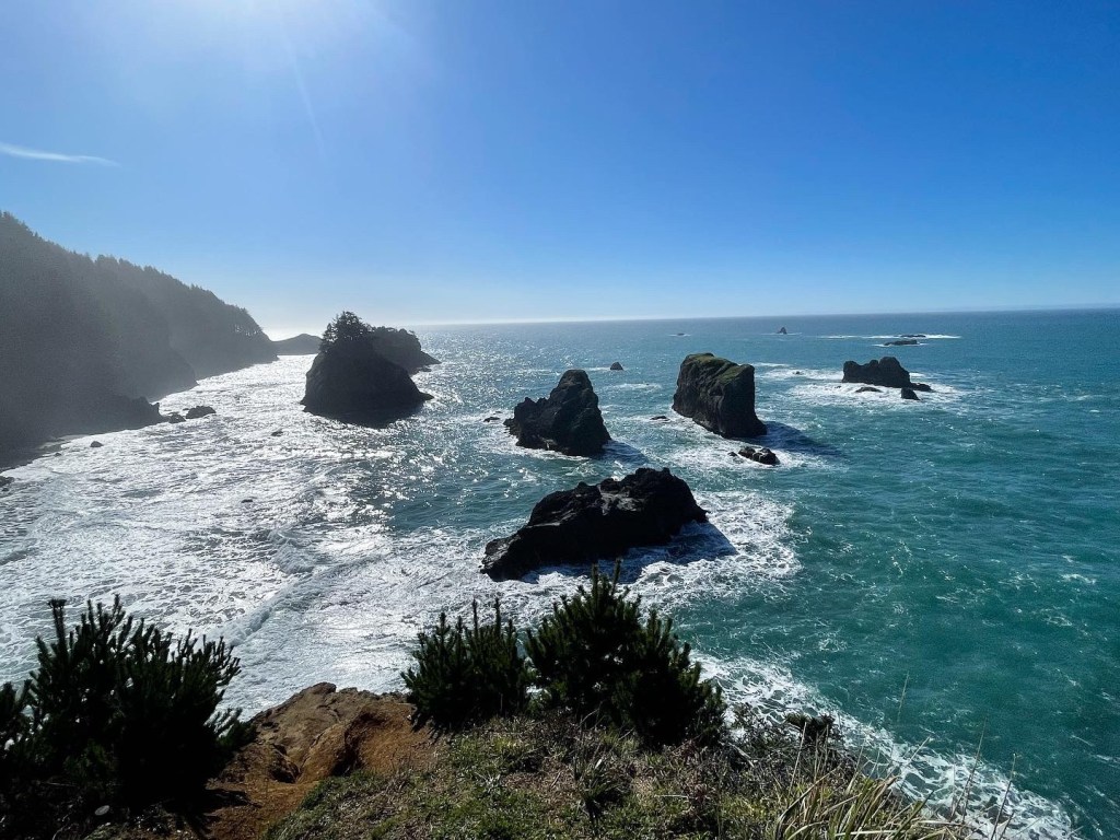 Brookings– If you go anywhere along the PCH, please stop here!! Samuel H. Boardman State Scenic Corridor offers so many beautiful sights. It goes up the PCH about 12 miles, and features some of the state’s only redwoods. You can explore as much or as little as you’d like. It has easy pull-offs, but the opportunity for many hikes. Regardless, you are not going to be disappointed in the views in this park. There are a few stops that I would recommend. (Cell service is very limited in the area and I wish I’d downloaded Google Maps with these spots before going, thus why I had a hard time and missed out on some areas).