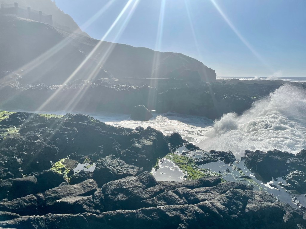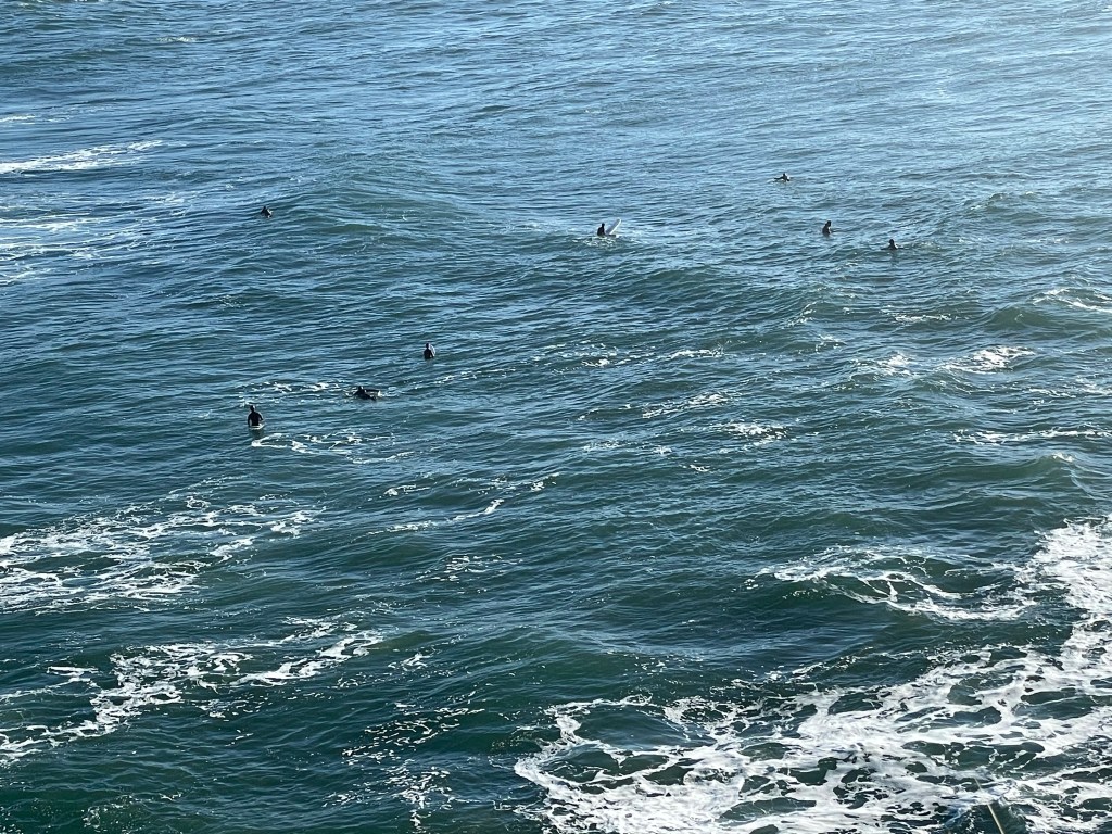 The first stop here was the Devil’s Punchbowl. There is ample parking, where you can walk straight up to the fence and watch the waves churn inside the bowl. A short walk over, you can view a pretty beach. You may see a large group of surfers surfing in February randomly, like I did.